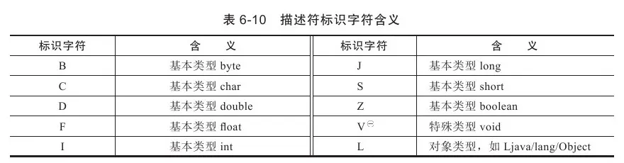 描述符的作用是用来描述字段的数据类型、方法的参数列表(包括数量、类型以及顺序)和返回值。根据描述符规则,基本数据类型(byte、char、double、float、int、long、short、boolean)以及代表无返回值的void类型都用一个大写字符来表示,而对象类型则用字符L加对象的全限定名来表示,详见表。void类型在虚拟机规范之中单独列出为“Void Descriptor”。对于数组类型,每一维度将使用一个前置的“[”字符来描述,如一个定义为“java.lang.String[][]”类型的二维数组,将被记录为:“[[Ljava/lang/String;”,一个整型数组“int[]”将被记录为“[I”。用描述符来描述方法时,按照先参数列表,后返回值的顺序描述,参数列表按照参数的严格顺序放在一组小括号“()”之内。如方法void inc()的描述符为“()V”,方法java.lang.String toString()的描述符为“()Ljava/lang/String;”,方法int indexOf(char[]source,int sourceOffset,int sourceCount,char[]target,int targetOffset,int targetCount,int fromIndex)的描述符为“([CII[CIII)I”。