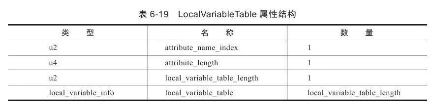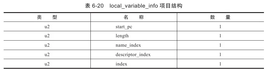 其中,local_variable_info项目代表了一个栈帧与源码中的局部变量的关联,结构见表6-20。