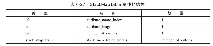 StackMapTable属性中包含零至多个栈映射帧(Stack Map Frames),每个栈映射帧都显式或隐式地代表了一个字节码偏移量,用于表示该执行到该字节码时局部变量表和操作数栈的验证类型。类型检查验证器会通过检查目标方法的局部变量和操作数栈所需要的类型来确定一段字节码指令是否符合逻辑约束。StackMapTable属性的结构见表6-27。