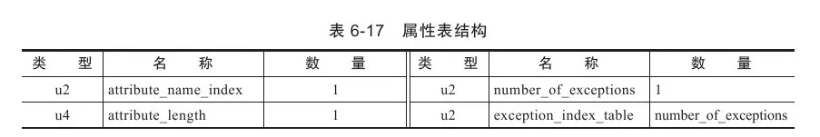 这里的Exceptions属性是在方法表中与Code属性平级的一项属性,不要与前面刚刚讲解完的异常表产生混淆。Exceptions属性的作用是列举出方法中可能抛出的受查异常(Checked Excepitons),也就是方法描述时在throws关键字后面列举的异常。它的结构见表6-17。