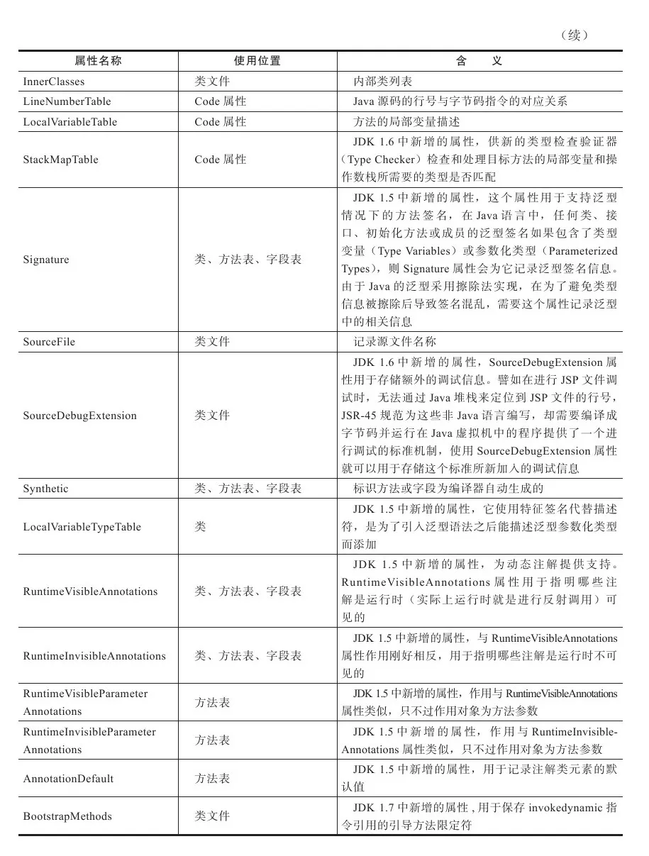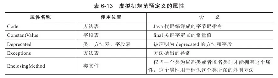 与Class文件中其他的数据项目要求严格的顺序、长度和内容不同,属性表集合的限制稍微宽松了一些,不再要求各个属性表具有严格顺序,并且只要不与已有属性名重复,任何人实现的编译器都可以向属性表中写入自己定义的属性信息,Java虚拟机运行时会忽略掉它不认识的属性。为了能正确解析Class文件,《Java虚拟机规范(第2版)》中预定义了9项虚拟机实现应当能识别的属性,而在最新的《Java虚拟机规范(Java SE 7)》版中,预定义属性已经增加到21项,具体内容见表6-13。下文中将对其中一些属性中的关键常用的部分进行讲解。