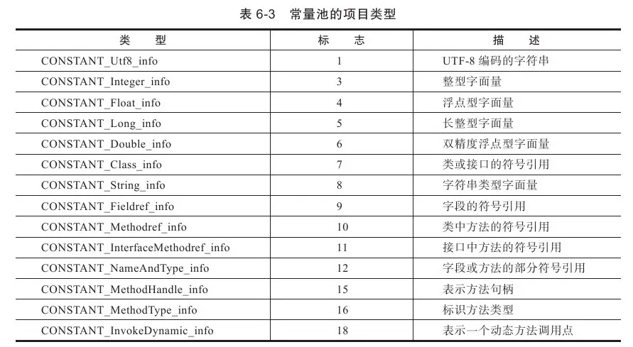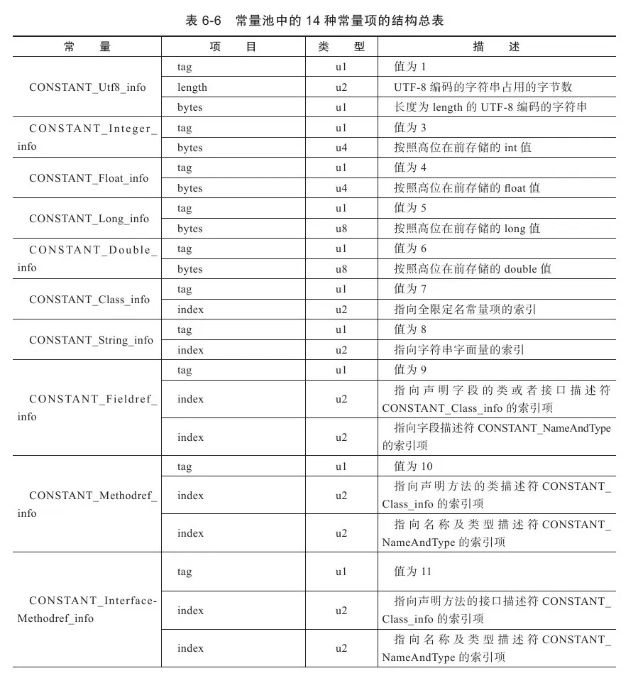 常量池中每一项常量都是一个表,在JDK 1.7之前共有11种结构各不相同的表结构数据,在JDK 1.7中为了更好地支持动态语言调用,又额外增加了3种(CONSTANT_MethodHandle_info、CONSTANT_MethodType_info和CONSTANT_InvokeDynamic_info这14种表都有一个共同的特点,就是表开始的第一位是一个u1类型的标志位(tag),代表当前这个常量属于哪种常量类型。这14种常量类型所代表的具体含义见表。之所以说常量池是最烦琐的数据,是因为这14种常量类型各自均有自己的结构。