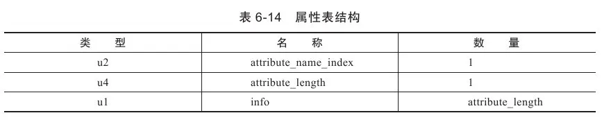 对于每个属性,它的名称需要从常量池中引用一个CONSTANT_Utf8_info类型的常量来表示,而属性值的结构则是完全自定义的,只需要通过一个u4的长度属性去说明属性值所占用的位数即可。一个符合规则的属性表应该满足表6-14中所定义的结构。