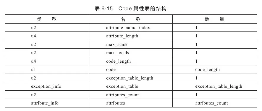 code_length和code用来存储Java源程序编译后生成的字节码指令。code_length代表字节码长度,code是用于存储字节码指令的一系列字节流。既然叫字节码指令,那么每个指令就是一个u1类型的单字节,当虚拟机读取到code中的一个字节码时,就可以对应找出这个字节码代表的是什么指令,并且可以知道这条指令后面是否需要跟随参数,以及参数应当如何理解。我们知道一个u1数据类型的取值范围为0x00~0xFF,对应十进制的0~255,也就是一共可以表达256条指令,目前,Java虚拟机规范已经定义了其中约200条编码值对应的指令含义,编码与指令之间的对应关系可查阅本书的附录B“虚拟机字节码指令表”。