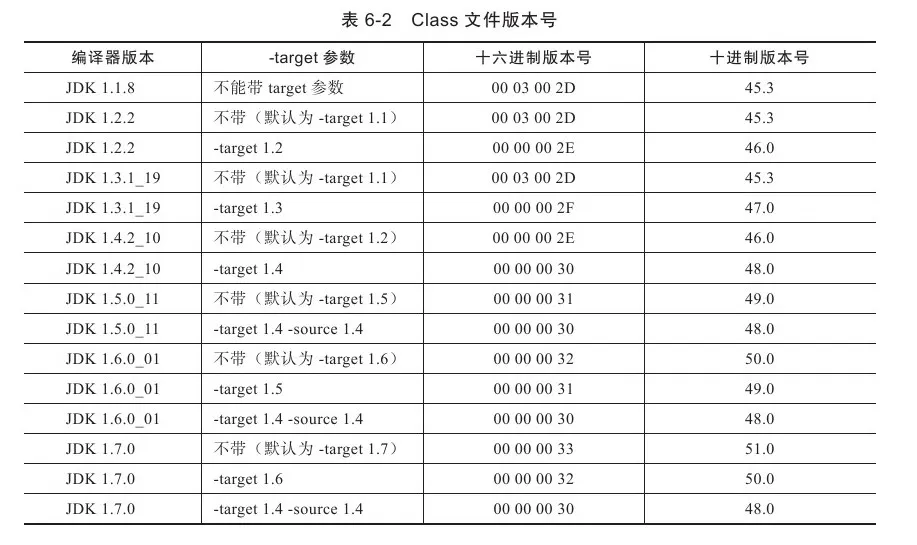 紧接着魔数的4个字节存储的是Class文件的版本号:第5和第6个字节是次版本号(Minor Version),第7和第8个字节是主版本号(Major Version)。Java的版本号是从45开始的,JDK 1.1之后的每个JDK大版本发布主版本号向上加1(JDK 1.0~1.1使用了45.0~45.3的版本号),高版本的JDK能向下兼容以前版本的Class文件,但不能运行以后版本的Class文件,即使文件格式并未发生任何变化,虚拟机也必须拒绝执行超过其版本号的Class文件。