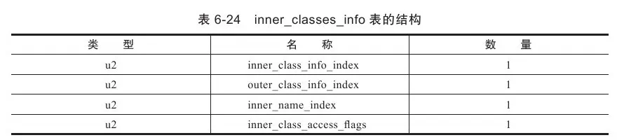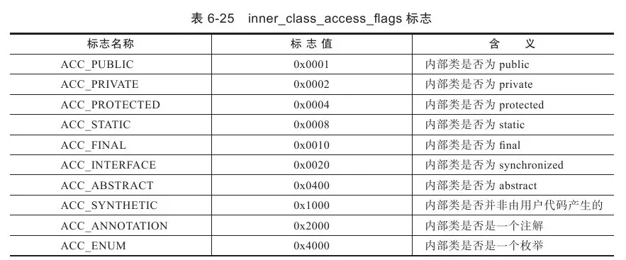 inner_class_access_flags是内部类的访问标志,类似于类的access_flags,它的取值范围见表6-25。