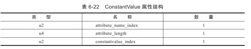 虽然有final关键字才更符合“ConstantValue”的语义,但虚拟机规范中并没有强制要求字段必须设置了ACC_FINAL标志,只要求了有ConstantValue属性的字段必须设置ACC_STATIC标志而已,对final关键字的要求是Javac编译器自己加入的限制。而对ConstantValue的属性值只能限于基本类型和String,因为此属性的属性值只是一个常量池的索引号,由于Class文件格式的常量类型中只有与基本属性和字符串相对应的字面量,所以就算ConstantValue属性想支持别的类型也无能为力。ConstantValue属性的结构见表6-22。