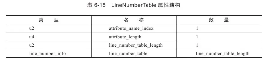 line_number_table是一个数量为line_number_table_length、类型为line_number_info的集合,line_number_info表包括了start_pc和line_number两个u2类型的数据项,前者是字节码行号,后者是Java源码行号。