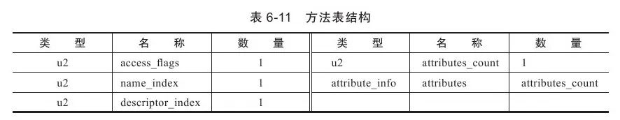 如果理解了关于字段表的内容,那关于方法表的内容将会变得很简单。Class文件存储格式中对方法的描述与对字段的描述几乎采用了完全一致的方式,方法表的结构如同字段表一样,依次包括了访问标志(access_flags)、名称索引(name_index)、描述符索引(descriptor_index)、属性表集合(attributes)几项,见表6-11。这些数据项目的含义也非常类似,仅在访问标志和属性表集合的可选项中有所区别。