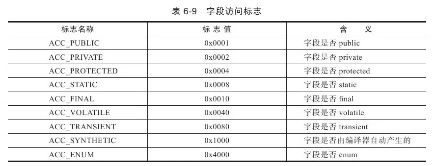 字段修饰符放在access_flags项目中,它与类中的access_flags项目是非常类似的,都是一个u2的数据类型,其中可以设置的标志位和含义见表6-9。