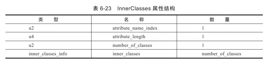 InnerClasses属性用于记录内部类与宿主类之间的关联。如果一个类中定义了内部类,那编译器将会为它以及它所包含的内部类生成InnerClasses属性。该属性的结构见表6-23。