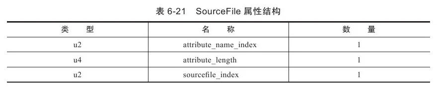SourceFile属性用于记录生成这个Class文件的源码文件名称。这个属性也是可选的,可以分别使用Javac的-g:none或-g:source选项来关闭或要求生成这项信息。在Java中,对于大多数的类来说,类名和文件名是一致的,但是有一些特殊情况(如内部类)例外。如果不生成这项属性,当抛出异常时,堆栈中将不会显示出错代码所属的文件名。这个属性是一个定长的属性,其结构见表6-21。