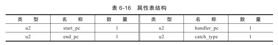 在字节码指令之后的是这个方法的显式异常处理表(下文简称异常表)集合,异常表对于Code属性来说并不是必须存在的,异常表的格式如表6-16所示,它包含4个字段,这些字段的含义为:如果当字节码在第start_pc行(此处字节码的“行”是一种形象的描述,指的是字节码相对于方法体开始的偏移量,而不是Java源码的行号,下同。)到第end_pc行之间(不含第end_pc行)出现了类型为catch_type或者其子类的异常(catch_type为指向一个CONSTANT_Class_info型常量的索引),则转到第handler_pc行继续处理。当catch_type的值为0时,代表任意异常情况都需要转向到handler_pc处进行处理。