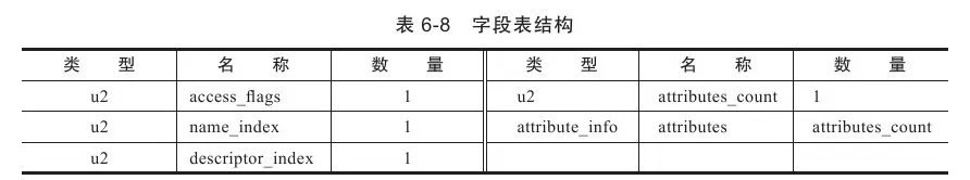 - 字段表集合中不会列出从超类或者父接口中继承而来的字段,但有可能列出原本Java代码之中不存在的字段,譬如在内部类中为了保持对外部类的访问性,会自动添加指向外部类实例的字段。