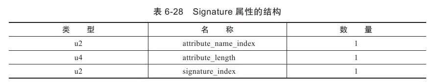 Signature属性在JDK 1.5发布后增加到了Class文件规范之中,它是一个可选的定长属性,可以出现于类、属性表和方法表结构的属性表中。在JDK 1.5中大幅增强了Java语言的语法,在此之后,任何类、接口、初始化方法或成员的泛型签名如果包含了类型变量(Type Variables)或参数化类型(Parameterized Types),则Signature属性会为它记录泛型签名信息。之所以要专门使用这样一个属性去记录泛型类型,是因为Java语言的泛型采用的是擦除法实现的伪泛型,在字节码(Code属性)中,泛型信息编译(类型变量、参数化类型)之后都通通被擦除掉。使用擦除法的好处是实现简单(主要修改Javac编译器,虚拟机内部只做了很少的改动)、非常容易实现Backport,运行期也能够节省一些类型所占的内存空间。但坏处是运行期就无法像C#等有真泛型支持的语言那样,将泛型类型与用户定义的普通类型同等对待,例如运行期做反射时无法获得到泛型信息。Signature属性就是为了弥补这个缺陷而增设的,现在Java的反射API能够获取泛型类型,最终的数据来源也就是这个属性。Signature属性的结构见表6-28。