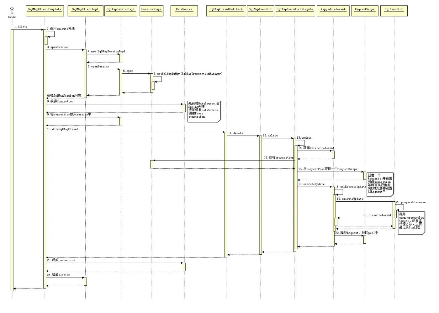 当使用者持有了 SqlMapClientImpl 对象就可以使用 iBATIS 来工作了。SqlMapExecutorDelegate 这个类从名字就可以看出他是执行代理类。这个类非常重要,重要是因为他耦合了用户端的执行操作行为和执行的环境,他持有执行操作的所需要的数据,同时提供管理着执行操作依赖的环境。所以他是一个强耦合的类,也可以看做是个工具类。