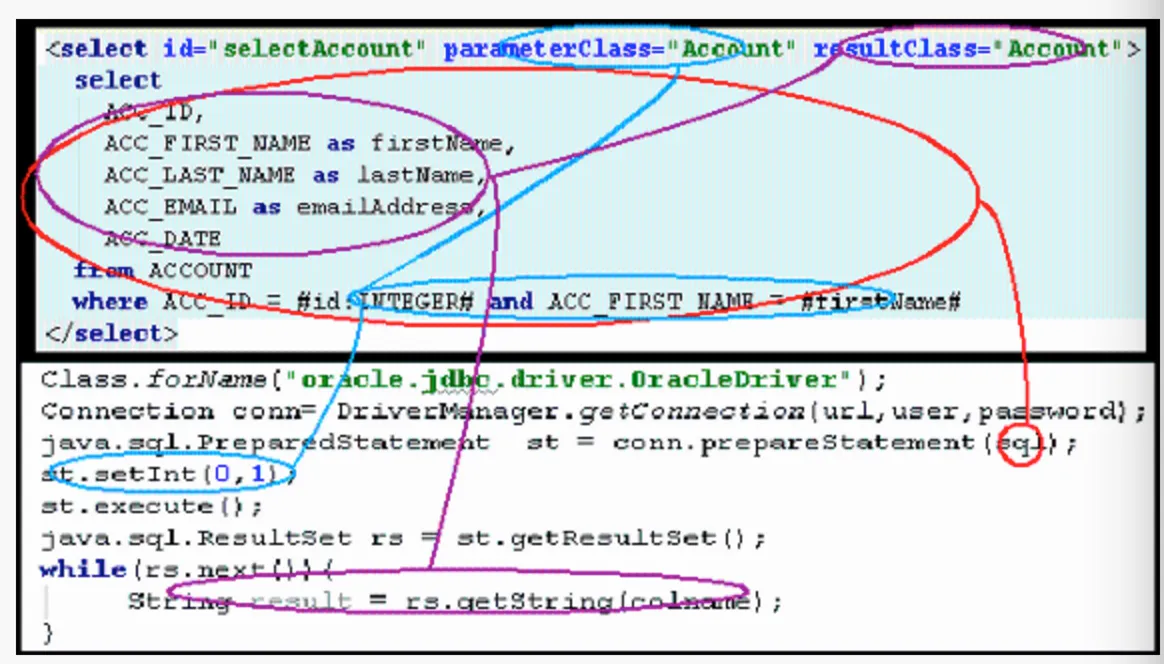 iBATIS 就是将上面这几行代码分解包装,但是最终执行的仍然是这几行代码。前两行是对数据库的数据源的管理包括事务管理,3、4 两行 iBATIS 通过配置文件来管理 SQL 以及输入参数的映射,6、7、8 行是 iBATIS 获取返回结果到 Java 对象的映射,也是通过配置文件管理。