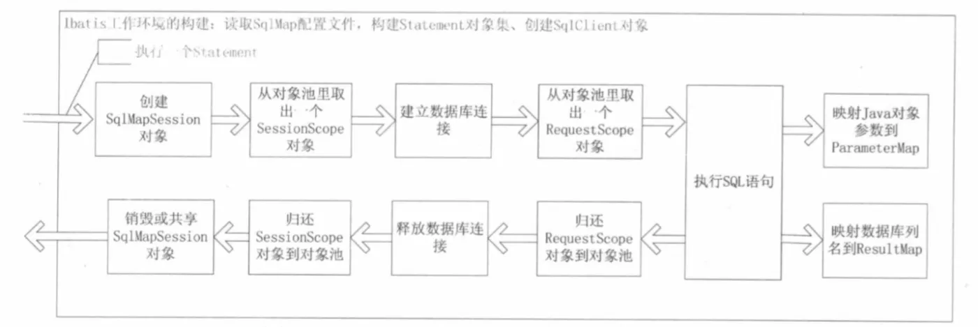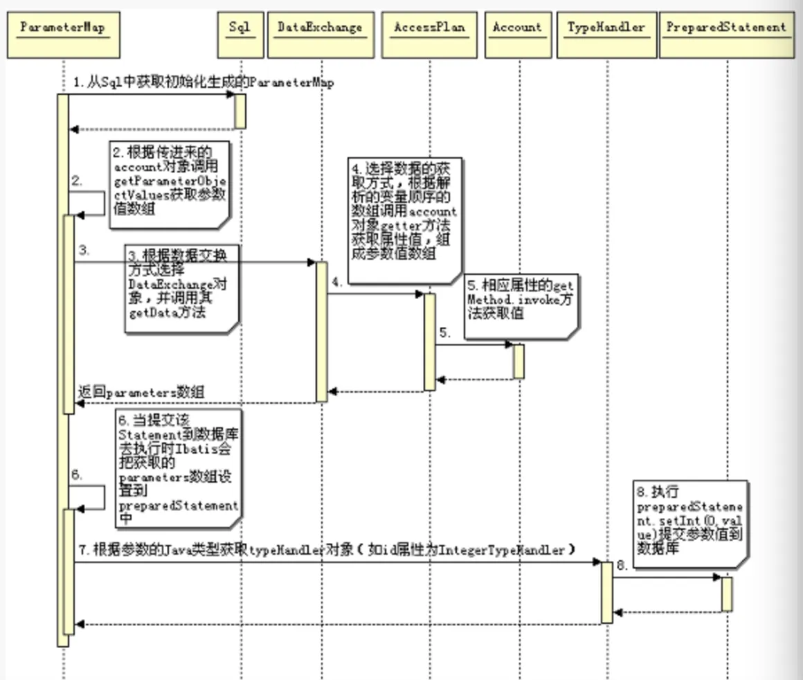 iBATIS 会把 SqlMap 配置文件解析成一个个 Statement,其中包括 ParameterMap、ResultMap,以及解析后的 SQL。当 iBATIS 构建好 RequestScope 执行环境后,要做的工作就是把传过来的对象数据结合 ParameterMap 中信息提取出一个参数数组,这个数组的顺序就是对应于 SQL 中参数的顺序,然后会调用 preparedStatement.setXXX(i, parameter) 提交参数。
