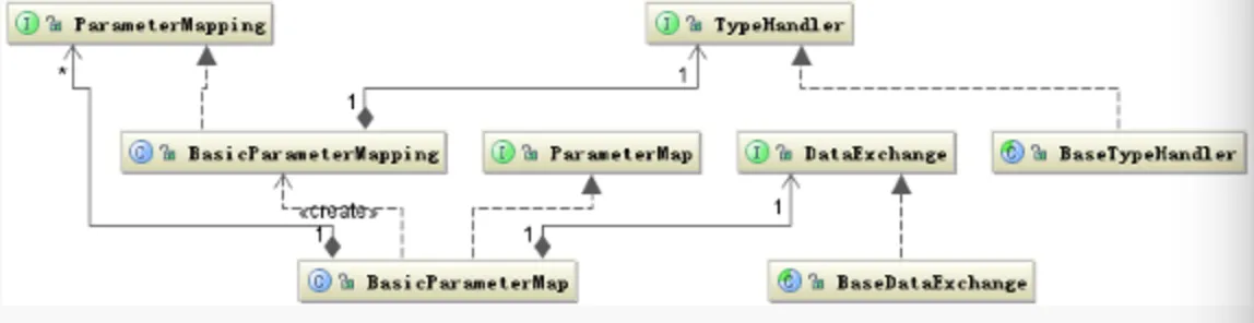 数据的映射大体的过程是这样的:根据 Statement 中定义的 SQL 语句,解析出其中的参数,按照其出现的顺序保存在 Map 集合中,并按照 Statement 中定义的 ParameterMap 对象类型解析出参数的 Java 数据类型。并根据其数据类型构建 TypeHandler(#id:INTEGER#) 对象,参数值的复制是通过 DataExchange 对象完成的。