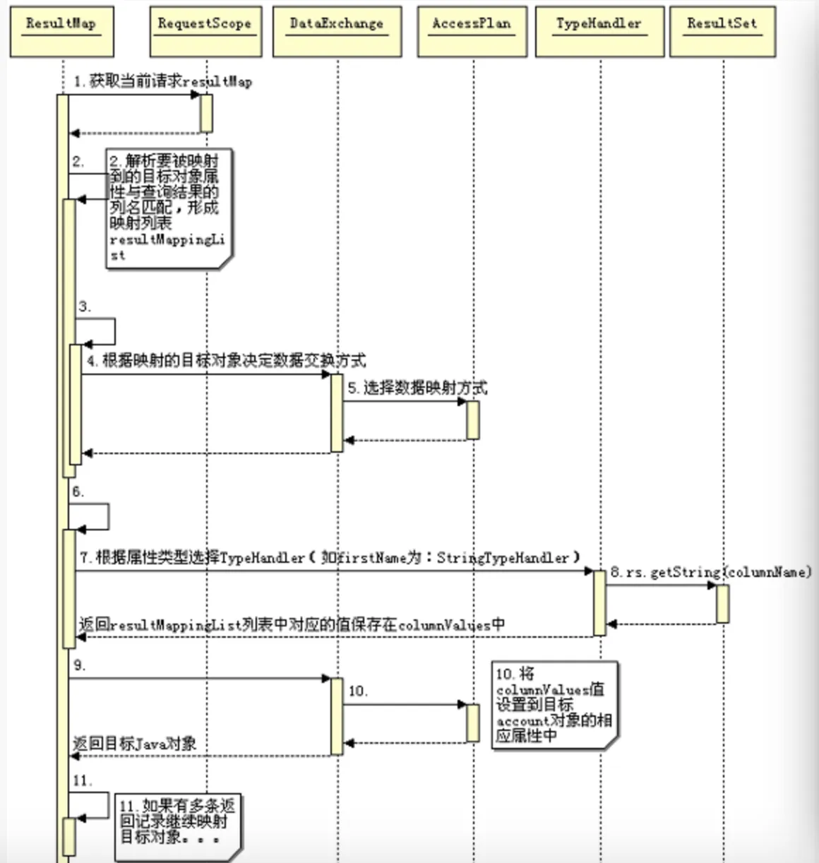 数据库执行完 SQL 后会返回执行结果,和 ParameterMap 类似,填充返回信息需要的资源都已经包含在 ResultMap 中。当有了保存返回结果的 ResultSet 对象后,就是要把列名映射到 account 对象的对应属性中。这个过程大体如下: