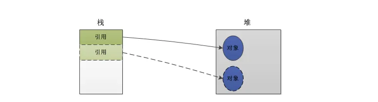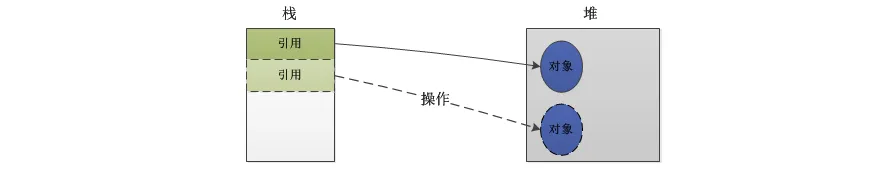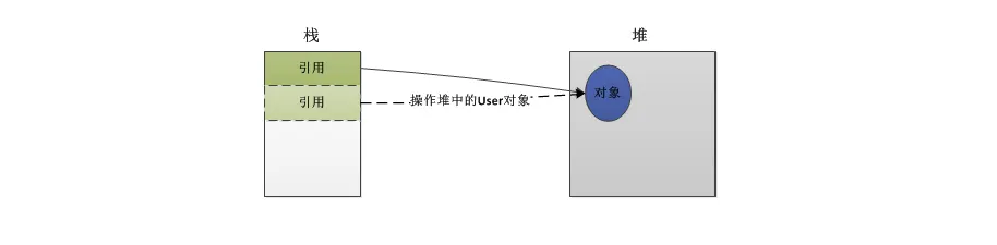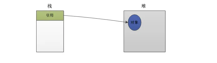 是在堆中创建了一个对象,并在栈中创建了一个引用,此引用指向该对象,如下图: