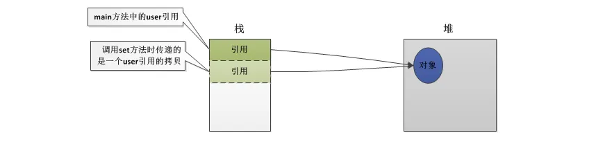 是将引用user作为参数传递到set方法,注意:这里传递的并不是引用本身,而是一个引用的拷贝。也就是说这时有两个引用(引用和引用的拷贝)同时指向堆中的对象,如下图: