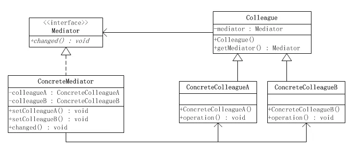 ● 抽象同事类(Colleague)角色:定义出调停者到同事对象的接口。同事对象只知道调停者而不知道其余的同事对象。