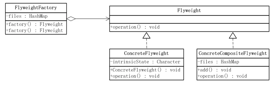 Composite模式:Flyweight模式通常和Composite模式结合起来,用共享叶结点的有向无环图实现一个逻辑上的层次结构。复合享元模式实际上是单纯享元模式与合成模式的组合。单纯享元对象可以作为树叶对象来讲,是可以共享的,而复合享元对象可以作为树枝对象, 因此在复合享元角色中可以添加聚集管理方法。通常,最好用Flyweight实现State 和Strategy对象。