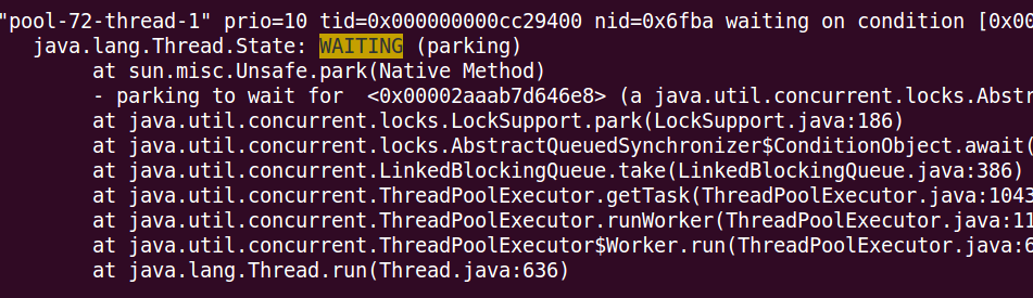 WAITING 或者 BLOCKED的时候, 要小心了, 他可能在等待资源经常没有得到释放(当然, 线程池的调度用的也是各种队列各种锁, 要区分一下, 比如下图)