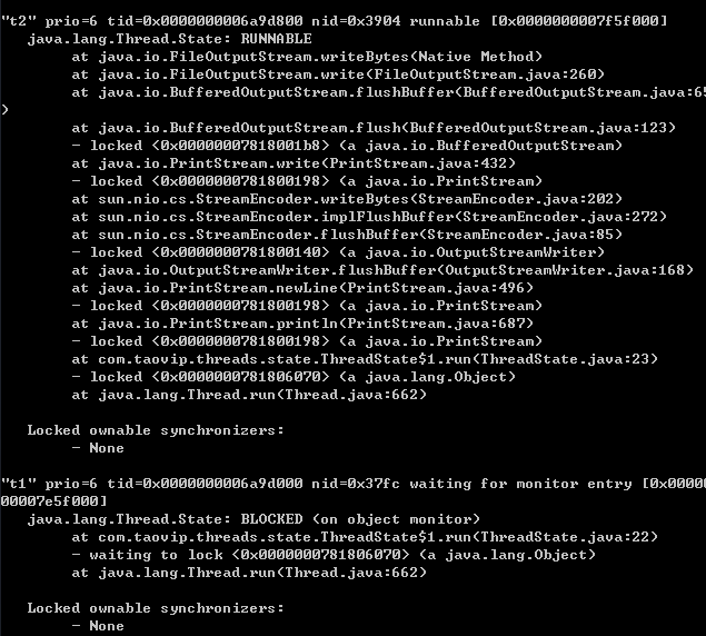这时候, 一个在RUNNABLE, 另一个就会在BLOCKED (等待另一个线程的 System.out.println.. 这是个IO操作, 属于系统资源, 不会造成WAITING等)