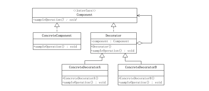 装饰(Decorator)角色:持有一个构件(Component)对象的实例,并定义一个与抽象构件接口一致的接口。
