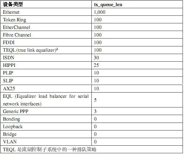 设备发送队列的长度。如果内核中包含了流量控制子系统,这个变量可能没有什么用(只有几个排队策略会使用它)。常见设备的 tx_queue_len 值(这个值可以通过sysfs文件系统修改(在/sys/class/net/device_name/目录下)):