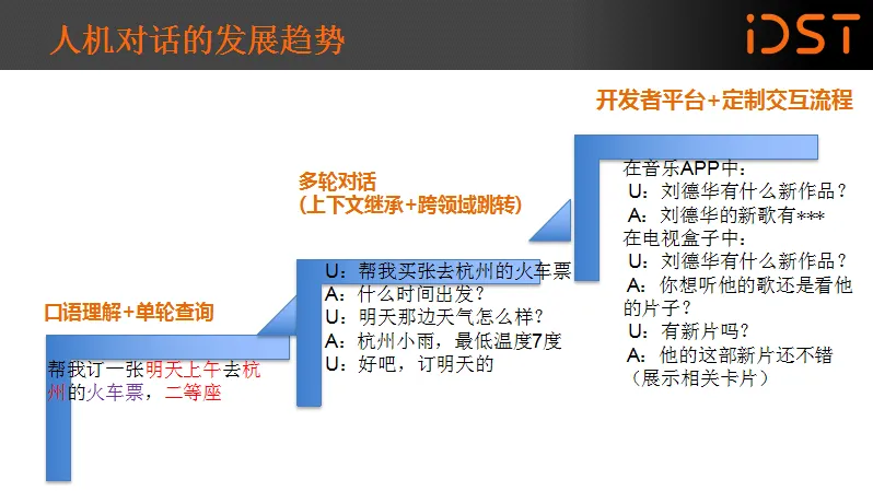 从上图可以看到,人机对话分为口语理解+单轮查询、多轮对话、开发者平台+定制交互流程三个阶段。其中各阶段最为核心的在于自然语言的理解,例如在“订一张上海飞北京的头等舱,下午5点出发,国航的”语句中,通过分类器将场景中最为重要的参数提取出来,然后用到火车票的数据服务去取结果并返回给用户。但用户往往不能在一句话中把所有的信息都提供出来。那么就需要通过多轮对话明确用户意图,一般是分为两个阶段:第一阶段,通过对话得到结构化查询;第二阶段,将查询的结果通过自然语言反馈给用户。