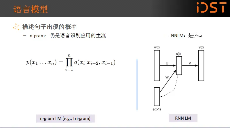 关于语言模型,它本质就是描述句子出现的概率。通常符合人说话规律的句子的概率会高于随机词组组合而成的语句。过去流行的模型是n-gram模型,现在仍然是主流模型之一。但是目前的研究热点是RNN模型。从套路上讲,语音识别在过去的二三十年内并没有发生太大的变化。真正的变化在于深度学习本身。