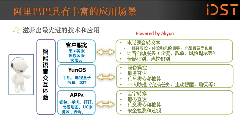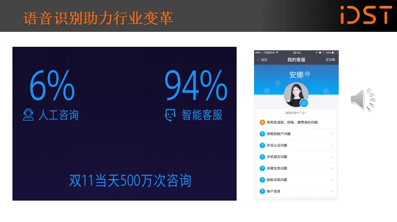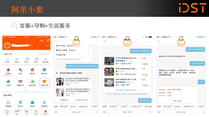 最后一个案例是阿里集团客服的合作——手机淘宝中的阿里小蜜,它通过语音的交互实现售前、售中、售后的打通,全方位的为消费者服务。