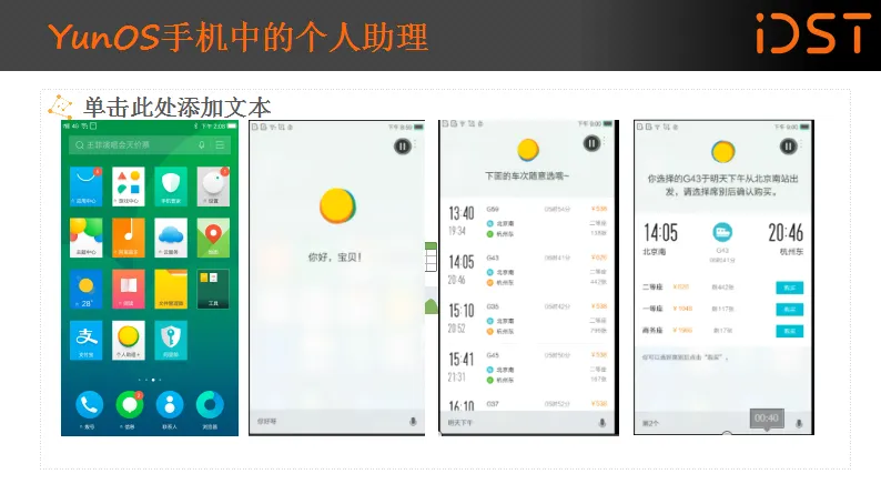 另外一个是在YunOS手机中的个人助理,其中包含了二十几个领域的信息,还包括一些可执行命令,例如设闹钟、发短信、打电话等。后续还会加入人性化的功能。