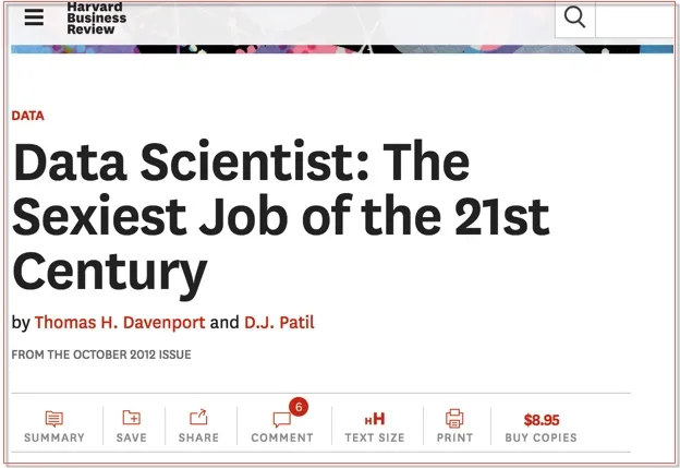 之后,大数据时代来临,千“数”万“树”梨花开,各种数据概念扑面而来。在2012 年,Babson商学院资深教授Thomas H. Davenport等人在文字上小做修饰,在《哈佛商业周刊》刊文指出,“在21 世纪,数据科学家是最性感的职业”(如图1所示)。在本质上,Davenport提出的“数据科学家”,基本等同于Varian所说的“统计学家”。