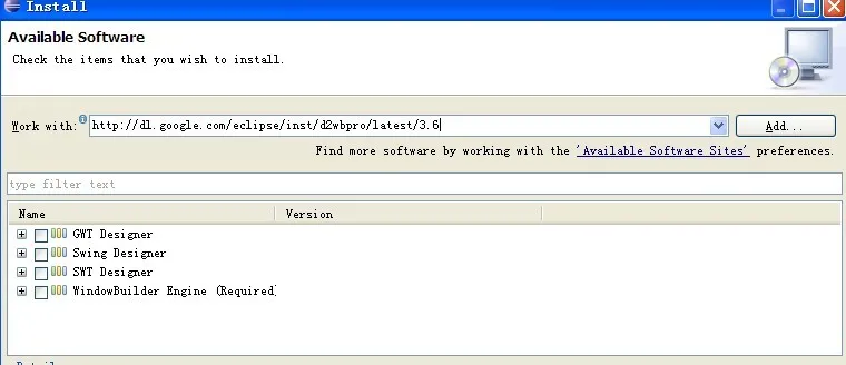 4、在“work with ”标记处输入网址http://dl.google.com/eclipse/inst/d2wbpro/latest/3.6,并回车,稍等片刻得到如图3所示界面