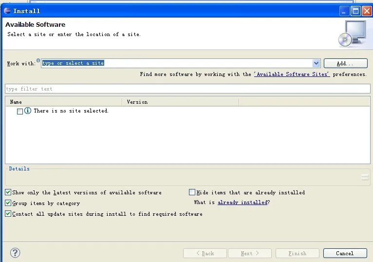 3、在Eclipse主界面依次选择Help→Install New Software,打开如图2所示界面