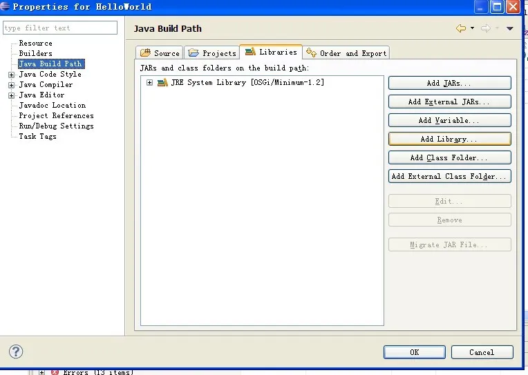 在左任务栏选择java构建路径,然后选择右界面选择 【库】 选项卡,点击 【添加外部JAR】: