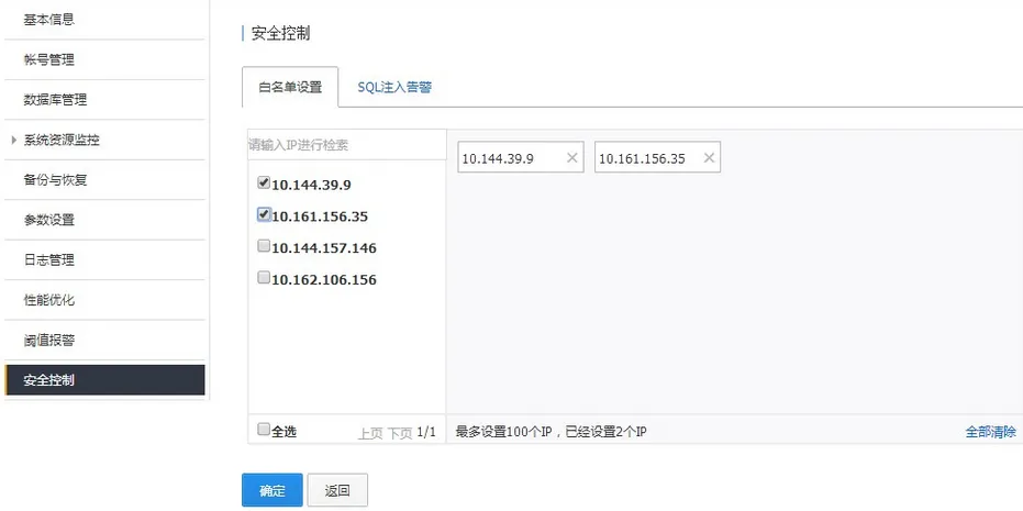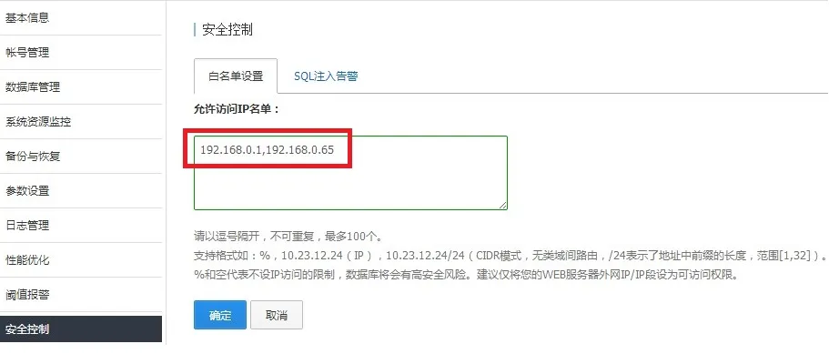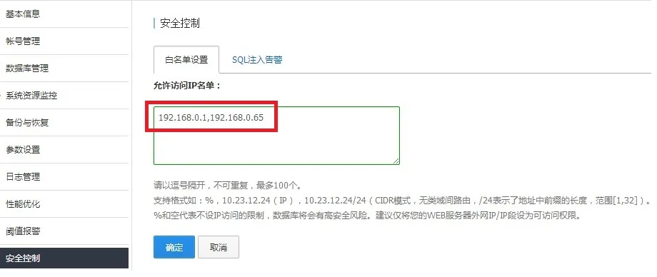 白名单可以使用户的RDS实例得到最高级的访问安全保护,建议用户在购买RDS实例后立即对IP白名单进行设置。默认IP名单为“%”,代表全网段均可访问,不受限制。 IP白名单支持设置IP地址和IP段,以逗号隔开(英文逗号‘,’),最多可设置100个。设置成功后仅有白名单中的IP地址可以访问实例。