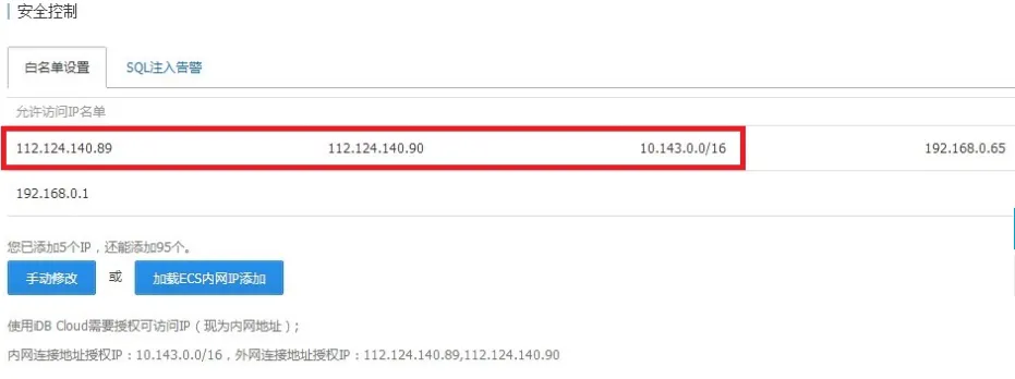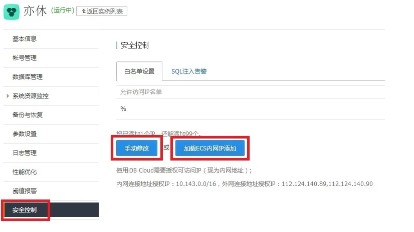 登录RDS管理控制台对应实例管理页面,进入“安全控制->白名单设置”,可看到允许访问IP名单列表。用户可点击“手动修改“按钮进行手动修改,如下图所示: