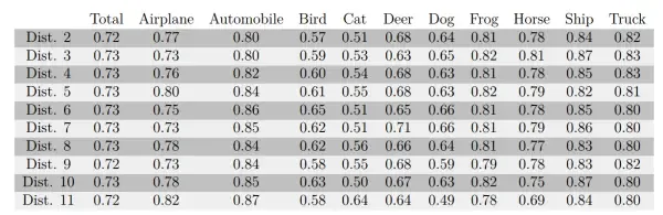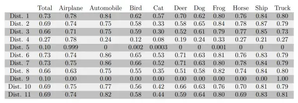 类别“越不平衡”,效果越差。比如Dist. 3就比Dist. 2更不平衡,效果就更差。同样的对比还有Dist. 4和Dist. 5,Dist. 8和Dist. 9。其中Dist. 5和Dist. 9更是完全训练失败了。