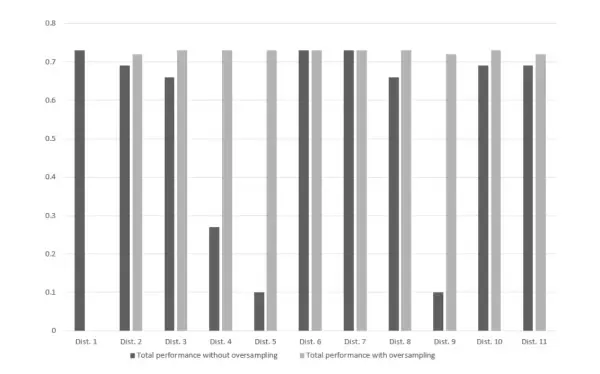 作者还实验了“过采样”(oversampling)这种平衡数据集的方法。这里的过采样方法是:对每一份数据集中比较少的类,直接复制其中的图片增大样本数量直至所有类别平衡。