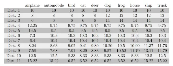 直接从原始CIFAR-10采样,通过控制每一类采样的个数,就可以产生类别不平衡的训练数据。如下表所示:这里的每一行就表示“一份”训练数据。而每个数字就表示这个类别占这“一份”训练数据的百分比。