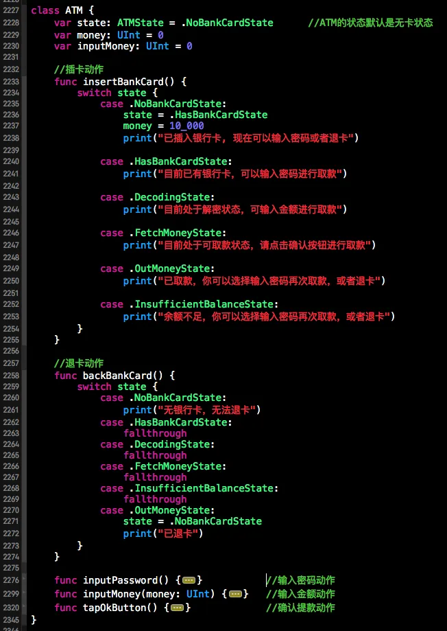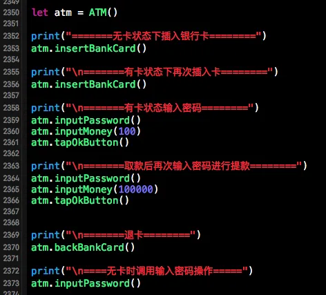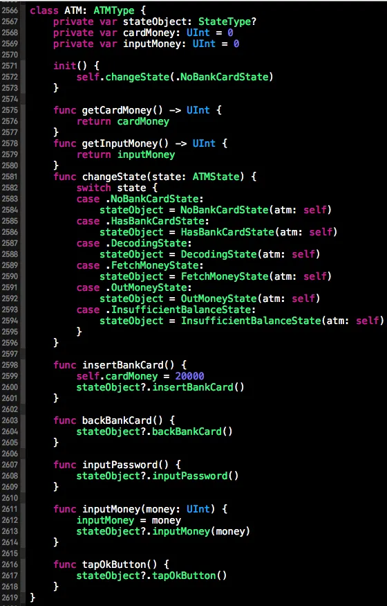 接下来就是要重构我们的ATM机类了,ATM类要遵循ATMType协议。其中的stateObject成员变量的类型就是stateType类型的对象,该对象就是ATM机当前所处的状态对象,该状态对象模式是NoBankCardState类的对象。在ATM类中的动作是调用stateObject对象中相应的方法,因为状态对象中已经封装了该状态下所有的动作,所以在ATM类中直接调用即可。如果ATM机状态被改变了,那么stateObject所执行的动作也会不同,这也就是常说的多态了。下方的changeState()方法其实可以提取出类封成一个简单工厂的,因为在此我们的主题是“状态模式”,所以在此就没有进行封装。ATM类的具体实现方式如下。