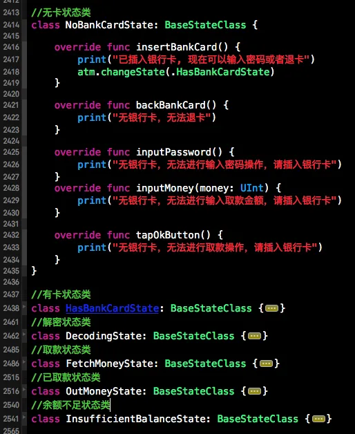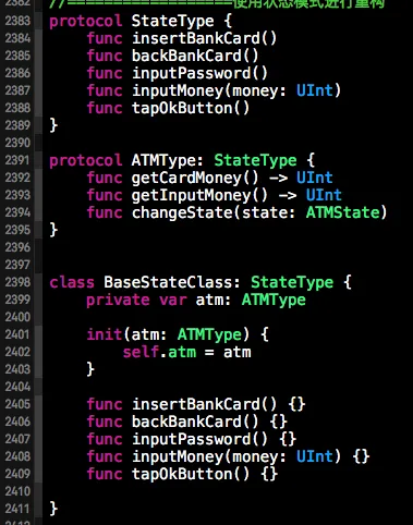 有了类图在给出代码实现则简单许多,首先我们会相关的接口和基类。因为我们要面向接口编程,而不是面向实现编程,所以在程序设计之初我们要先定义接口。下方就是我们定义的StateType接口和ATMType接口,以及BaseStateClass基类。StateType接口定义了所有具体的状态必须要实现的方法。而ATMType协议继承自StateType,在StateType的基础上添加了ATM机特有的方法,ATMType中声明的方法也是ATM具体实现类中必须要实现的方法。代码实现具体如下所示:
