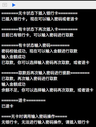 上面测试用例运行结果如下。从下方的输出结果中我们可以看出,无卡状态下插入卡会从无卡状态变为有卡状态。然后在有卡状态下再次插入银行卡会提示“目前已有银行卡,可以输入密码进行取款”。有卡状态下我们可以进行密码输入,金额输入,进行取款。取款成功可以再次输入密码进行二次取款,取款时如果余额不足,那么会成为余额不足状态。在余额不足状态时可以进行再次取款或者退出银行卡。说这么多,都是对上面状态图的反应。