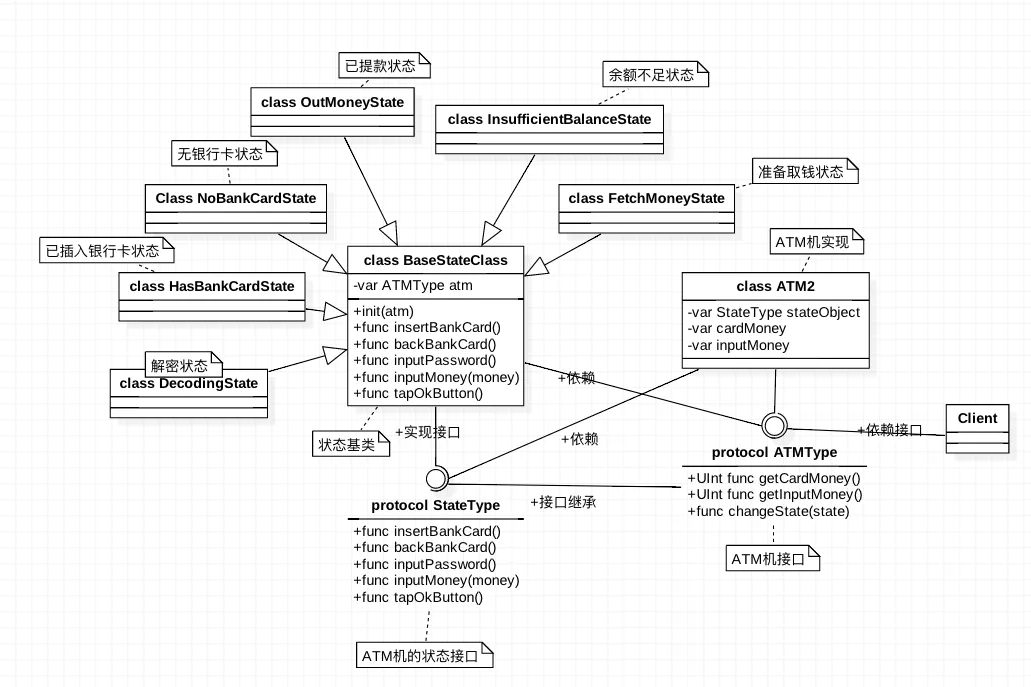 因为引入“状态模式”后,我们的ATM机稍微有些复杂,所以在此我们给出了类图的设计。下方就是我们将要使用代码进行实现的类图。要想实现“状态包含个个动作”的最好的方式就是为每个状态声明一个类,然后在类中实现该状态下的不同的操作。因为我们要依赖接口编程,而不依赖实现编程。所以我们创建了两个接口,一个是状态接口StateType,另一个则是ATM机接口ATMType。在StateType中声明了状态要包含的动作,因为这些动作也是ATM机的动作,所以我们的ATMType接口也遵循StateType接口。这也等同于ATMType中同样声明了这些动作,这些动作也是ATM机必须实现的。ATM机的类则遵循与ATMType协议。BaseStateClass是所有状态的基类,该状态的基类依赖于ATMType接口,因为在状态中执行一些动作时会修改ATM机的状态,所以BaseStateClass会依赖于ATMType协议。