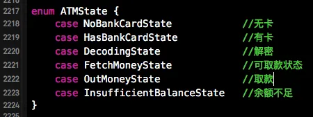在代码实现时,首先我们使用枚举来列举出所有的状态,此处我们命名为ATMState。下方代码段就是我们ATM机所有的状态,如下所示: